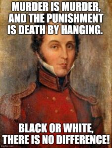 And there was Governor Bourke. One tribal massacre by settlers which really did happen – there may have been fabrications, but pretending they didn’t happen is fanciful – was at Myall Creek. Governor Bourke insisted that the murderers be tried and hanged. It took several attempts, but it happened eventually.