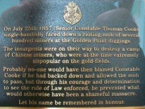 Were the Eureka miners really the heroes they have been painted? Nope. They have been fortunate in their mythmakers. And for too many years nobody even wanted to talk about the Chinese. My beloved has dealt with this far better than I ever could, most notably in her book The Castlemaine Murders. Lambing Flat in New South Wales was renamed because Chinese had been massacred there, and Her Majesty’s government decreed that the town was stained with murder, and must henceforth be known as Young. The same thing almost happened here in Victoria. The man who prevented the massacre was only known as Constable D24. It took Ms Greenwood (and her mother Jeannie) a great deal of research to put a name to Constable Thomas Cooke. Thanks to her agitation, and that of the Victoria Police Historical Society, Cooke has his rightful memorial at Castlemaine police station:
