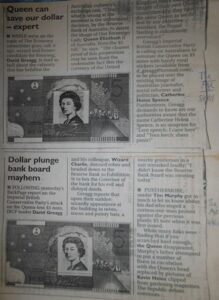 Phase One was to scan the image of the Queen from the old notes and make up a roll of stickers. Every time I got a five dollar bill, I stuck HM’s image into the middle of it. But you can’t do that! I was told. That’s Defacing the Currency! No it isn’t, I replied. What I am doing is refacing it. That’s different. Phase Two was the media campaign. Queen Can Save our Dollar – Expert was the magnificent headline I was granted:
