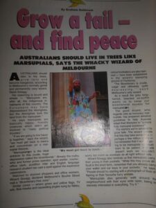 The biggest and most successful was my campaign to undo the Bicentennial, which I had privately decided was filled with bad magic. Yes, yes, we’ve managed 200 years of white settlement here. So let’s have some amazingly expensive celebrations all over Sydney. Our First Nations folk were predictably grumpy. Why would they not be? But I wanted something different which would possibly unite us all. So I suggested that we should celebrate twenty million years of marsupial civilization in Australia. I wrote a Wombat Anthem, which I recorded (to the tune of Waltzing Matilda), accompanying myself on a creaky old pedal harmonium, and placed it on my answering machine. And suddenly … the whole thing took off.