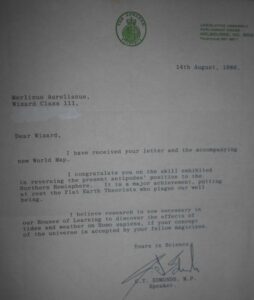 I did many other public spells during the 1980s, with varying degrees of success. My spiritual master advised us apprentice wizards to go out there and get our faces on TV and in the newspapers. I also presented the Archwizard’s South-Up world map (he thought of it first!) to the state Parliament and received this most courteous response: