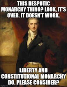 French philosophy being in the highest degree suspect, this should have been an awful warning not to become embroiled in a failed epistemology. And the National Assembly led inevitably to the French Revolution, which (unlike the Glorious Revolution of 1688, and the American Revolution of 1776) was characterised by anything other than moderation. Edmund Burke foresaw quite early on that the French had not reformed their polity. They had destroyed it. Little by little, all the English intelligentsia save Byron realised that he was right. The French had sown dragons’ teeth, and we got Napoleon Buonaparte and a twenty-two year war which laid much of Europe in ruins. Countless millions perished from war, disease and starvation.