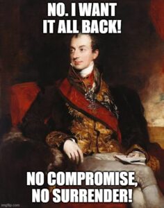Austria-Hungary limped on until the First World War, but Metternich’s refusal to listen to Castlereagh doomed his empire. Moderation works; extremism doesn’t. But Left and Right don’t work as a credible description. Those who think in clichés would have it that both these men are right-wingers. But this is hardly a helpful depiction.