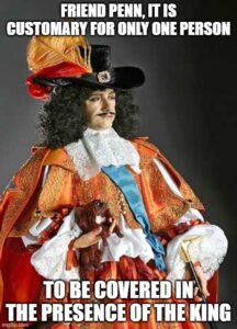 At the time, women’s contributions went unnoticed by the world at large. (The amount that this has changed in our own day is still disputed.) Among Friends themselves, men and women were regarded as equal from the beginning. This was a remarkably modernist view. It found no favour with their fellow Protestants at all. Friends were persecuted relentlessly until Charles II persuaded his Parliament to pass the Toleration Act. Charles had suffered torments in his youth from the crazy fanatics of the Kirk; and it doubtless brought a grim smile to his saturnine features to have their self-assumed right to persecute others suppressed. And William Penn was a friend of the King. One day when they met, Penn refused to take his hat off. This was the royal response: