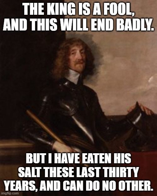 Many Cavaliers were under no illusions as to their King’s character and duplicity. At the first battle of Edgehill, Sir Edmund Verney carried Charles’ standard.