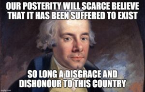 Sooner than make a fuss, Charles removed his own hat. It is certainly true that an entirely pacifist religion has an intractable problem with maintaining its own independence unaided. This charge has less force than is sometimes attributed it to it. Penn was a notable swordsman. Many a time he was challenged to a duel by enraged men of property. Trusting in his superior skills he would always accept, and easily disarmed his adversaries. Those who go about doing good and fear nothing but God can be a powerful force in the world. When they inspire the mighty by their dauntless example, the results can be spectacular. The Quaker Thomas Clarkson was the driving force behind the abolition of the slave trade. But it is equally true that nothing would have happened without William Wilberforce MP, and his increasing company of friends in both Houses of Parliament. I need not recapitulate the story, as it is retold (with only minor inaccuracies) in the film Amazing Grace.