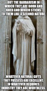 (On the subject of slavery, it is idle to pretend – as some now inexplicably do – that slavery was somehow a tool of European triumphalism. Every culture on Earth has practiced slavery at some point. Some slaves were treated well enough. Ancient Egypt, as ever, was something of an exemplar here. All too many were treated with frightful cruelty. We don’t do this any more. Except that we do. Since the expiry of the Pax Britannica, there are more slaves alive now than ever before.)