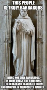Then … the Bloody Normans turned up. Whenever there’s Trooble Up At T’Mill, you’ll always find these tin-hatted fanatics. One of the petty kings asked for English help in one of his interminable squabbles. Give the Normans an inch, and they’ll take a mile. Suddenly Ireland belonged to England. King John – last and most thoroughly worthless son of Henry II – became their monarch. He took it into his head to have a Frat Boys’ Tour in which he insulted practically everyone. One of his party who could actually read and write was Giraldus Cambrensis. He wrote the following about the natives: