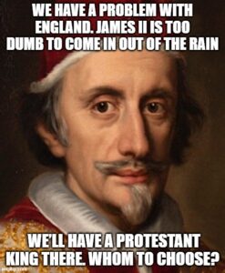 Oliver Cromwell is still remembered with loathing in Ireland. As well he may be. In his heart he was a Puritan from the previous century. He had not the slightest understanding of his western neighbour. He was largely merciful to his defeated enemies elsewhere; but to the Irish he gave nothing but fire and the sword. The wholesale depopulations of his regime were carried out by Fleetwood his deputy, yet he must bear the blame. Charles II by contrast left Ireland alone. He had bigger problems, like trying to wean his subjects off their anti-Catholic prejudices. But when his idiot brother James II was kicked off his throne, he ran away and attempted to regain his crown with Irish help. Here was a heaven-sent opportunity for the Irish to tell him to go away and annoy somebody else.